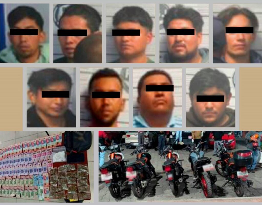 Nueve individuos ligados con extorsiones y distribución de sustancias prohibidas en al menos cuatro municipios probaron la acción de la justicia en Xonacatlán, tras quedar asegurados en posesión de motocicletas, efectivo y hierba verde con características de marihuana.