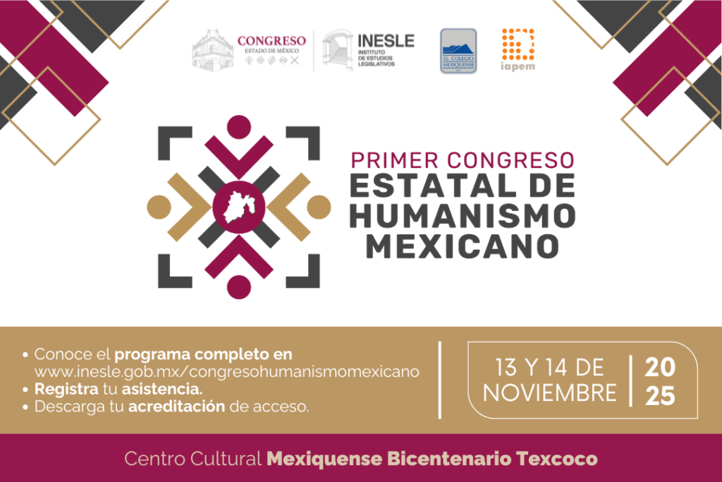 Con el propósito de contribuir al diálogo a propósito de los fundamentos teóricos del Humanismo Mexicano, el Congreso del Estado de México, por medio del Instituto de Estudios Legislativos (Inesle) y en coordinación con el Colegio Mexiquense, A.C. y el Instituto de Políticas Públicas del Estado de México y sus Municipios (IAPEM), llevará a cabo el Primer Congreso Estatal de Humanismo Mexicano, los próximos 13 y 14 de noviembre, en el Centro Cultural Mexiquense Bicentenario, en el municipio de Texcoco.