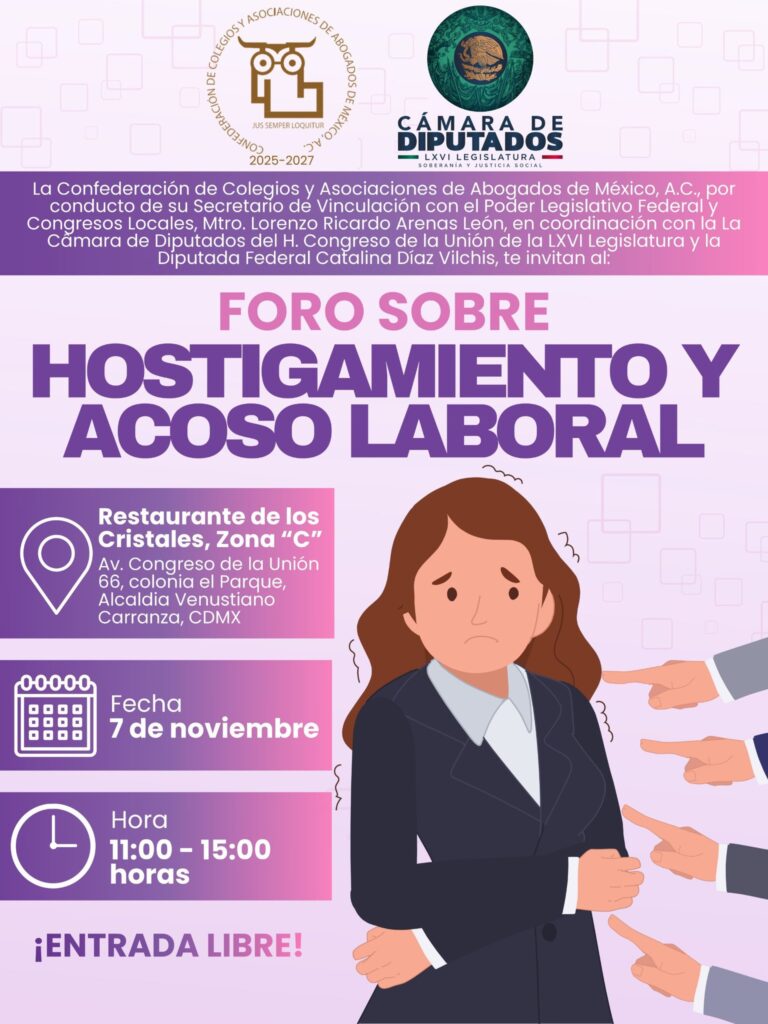 Apoyados por la Diputada Federal Catalina Díaz Vilchis, los abogados organizados de México, agrupados en la CONCAAM, convocan al Foro sobre Hostigamiento y Acoso Laboral, este viernes 7 de noviembre en el Congreso de la Unión, invitando a todos los interesados en el tema, con la participación de expertos y un espacio adecuado para el dialogo y la reflexión.
