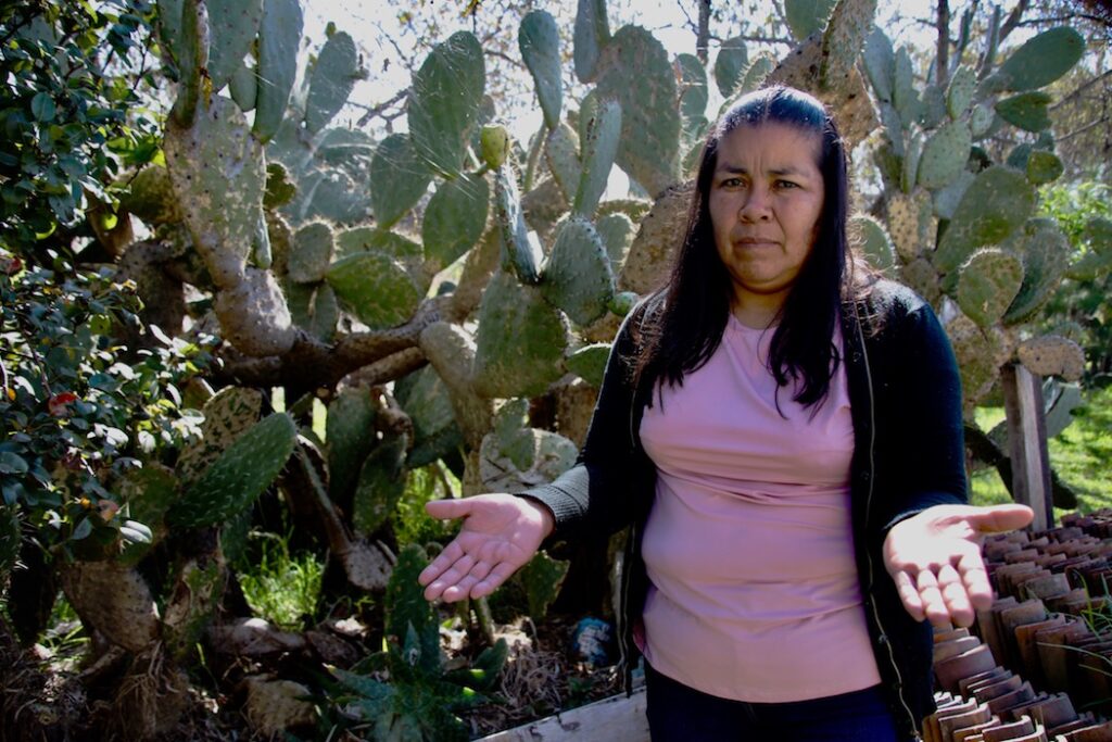Temoaya México. octubre 30 de 2025. La entrada es de tierra, y gran parte está cubierta de verde pasto. Guadalupe agita las manos, se alegra de vernos, “pásenle, pásenle, está es mi casa”. Un perro moviendo la cola sale a “recibirnos”, la entrada principal tiene una nopalera, atrás un pozo y una pileta con agua, al fondo una seca milpa se mueve con el aire y al hacerlo, produce un raro “coro” o sonido con el frotar de las hojas secas, Guadalupe camina entre la milpa, y hasta parece que a su paso los tallos de maíz la quieren abrazar. Nos invita a pasar a la sala de su casa.