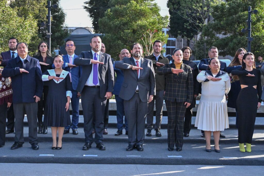 Diputadas, diputados y le diputade del Congreso mexiquense participaron en la ceremonia de arriamiento de la Bandera Nacional en la Plaza de los Mártires de Toluca, capital del Estado de México, con la asistencia de José Francisco Vázquez Rodríguez (morena), presidente de la Junta de Coordinación Política (Jucopo), y Martha Azucena Camacho Reynoso (morena), presidenta de la Directiva.