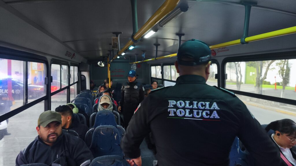 Toluca, Estado de México, 16 de febrero de 2026.– El Gobierno Municipal reforzó el operativo “Pasajero Seguro”, para inhibir conductas delictivas en el transporte público.