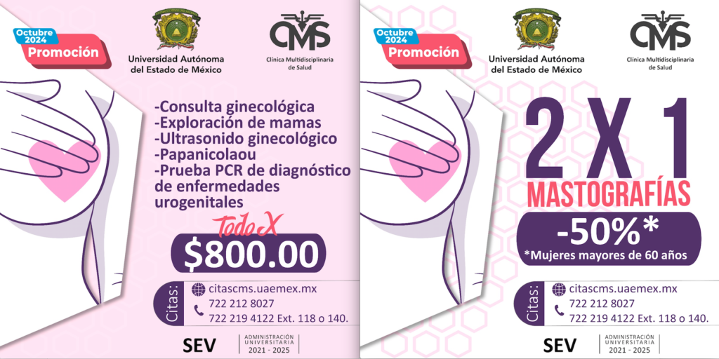 • La Clínica Multidisciplinaria de Salud (CMS) de la UAEMéx ofrece el Taller de Autoexploración de Mamas todos los jueves del mes de octubre, a las 9:00 horas, de manera gratuita, en las instalaciones de la CMS.