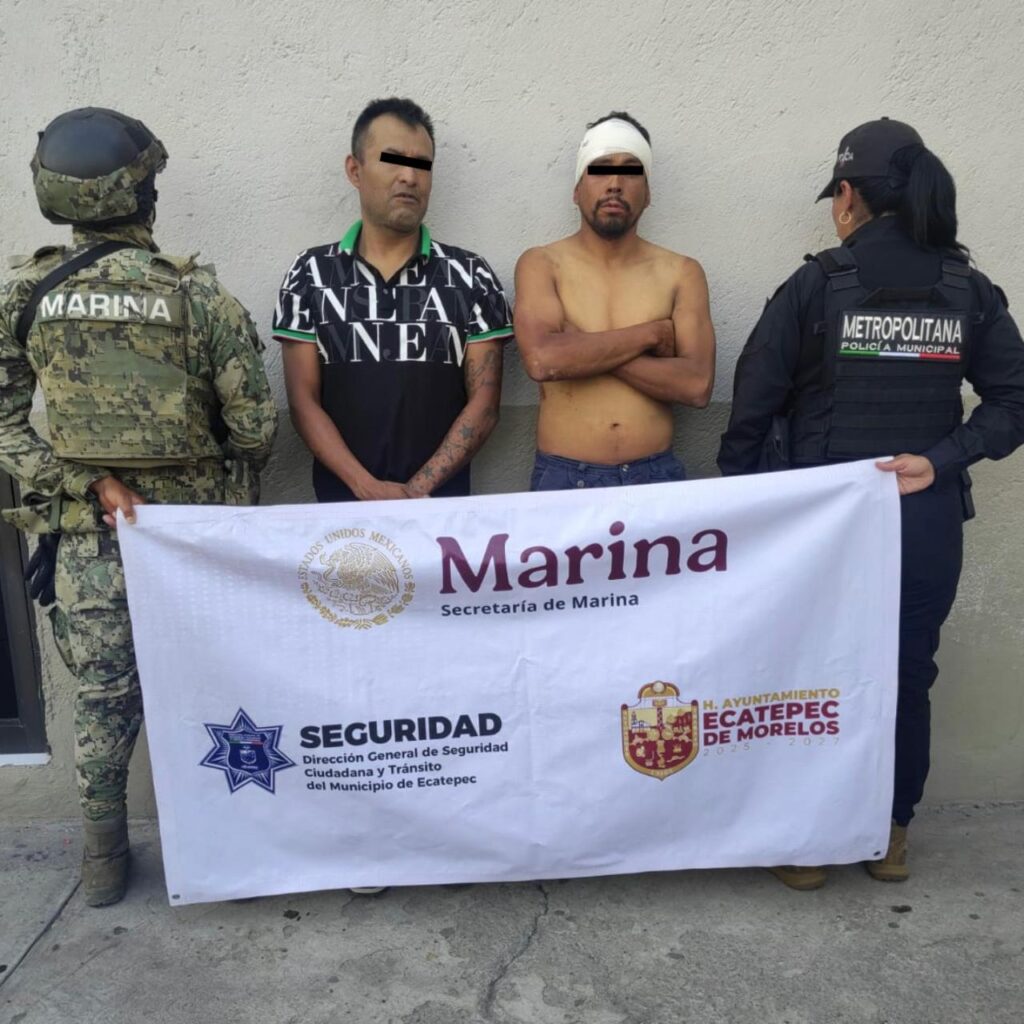 Ecatepec, Méx., a 19 de abril de 2026. Elementos de la policía metropolitana de Ecatepec detuvieron a dos sujetos como probables responsables del incendio en una recicladora clandestina asentada en zona federal en El Salado Xalostoc, que provocara el cierre de la Autopista Siervo de la Nación por posibles daños estructurales en la construcción.